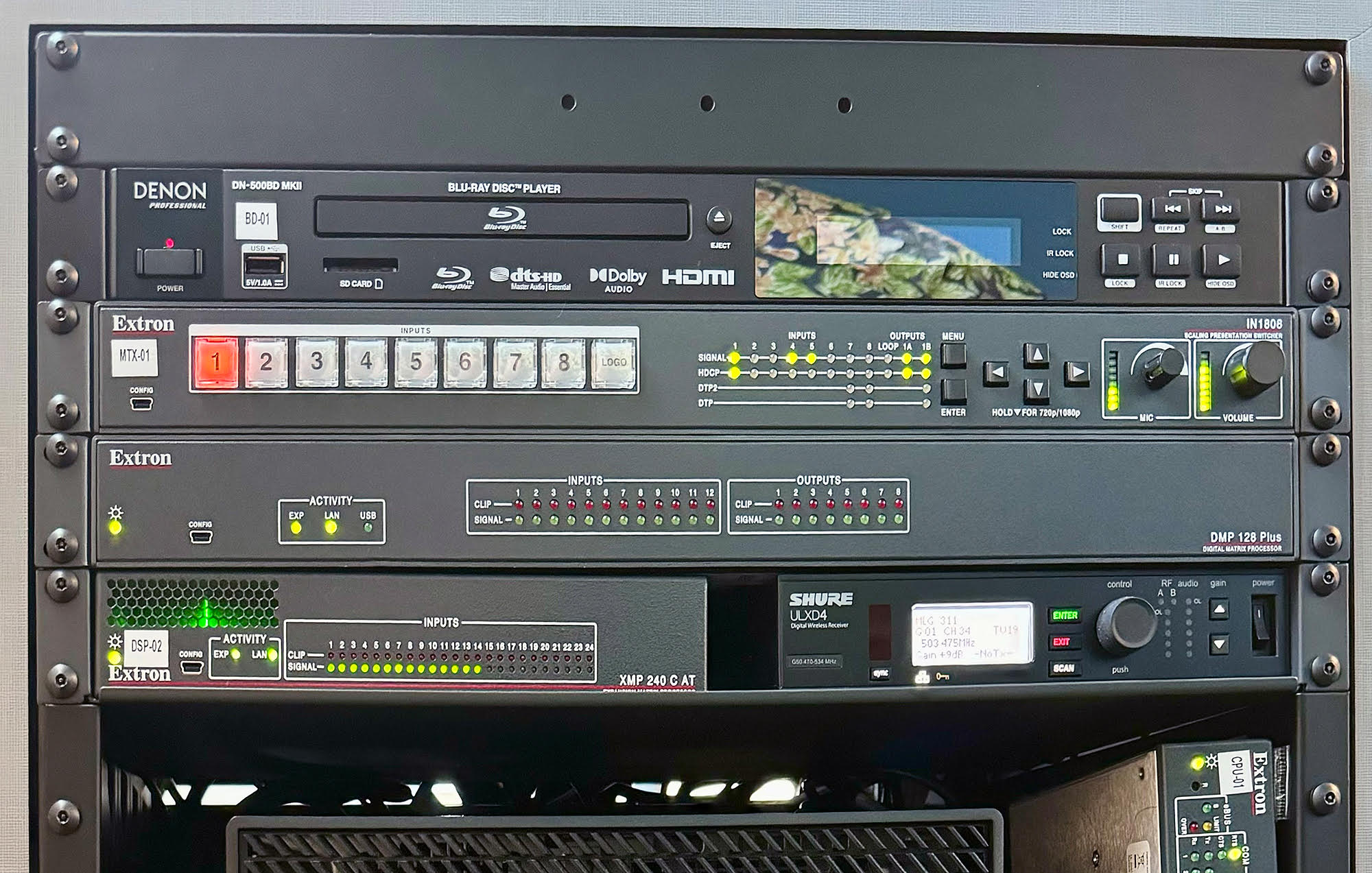 The facility features classrooms, laboratories, breakout rooms, and a 120-seat High Impact Practices (HIPS) seminar venue. Extron AV technology supports these spaces with a range of switching, transmission, audio, and control solutions. The system includes XTP II and DTP CrossPoint matrix switchers, IN1808 Series presentation switchers, SMP 352 streaming media processors, and ProDSP audio processors paired with SoundField speakers. TouchLink Pro touchpanels and IP Link Pro xi control processors provide user-friendly AV control, while TLS TouchLink scheduling panels help manage room availability.