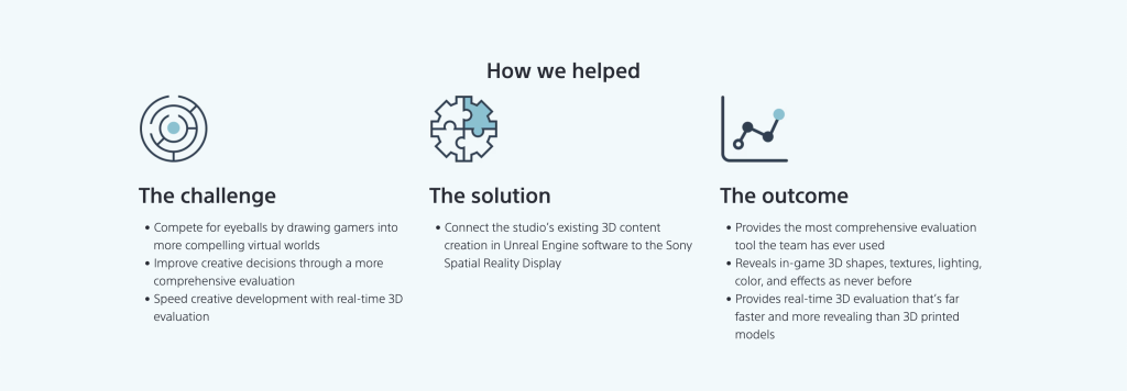 A leading independent game studio discovers better ways to evaluate 3D characters, creatures, textures, lighting, colors, and effects with Sony’s Spatial Reality Display.