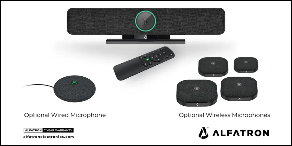 The system includes a built-in microphone array with a voice pickup range of up to 5 meters (16.4 feet). Alfatron also offers optional microphone solutions, including the ALF-MIC100W wireless microphone system with four microphones and the ALF-MIC100 wired microphone. When either optional microphone system is used, it overrides the VB100’s built-in microphone array.