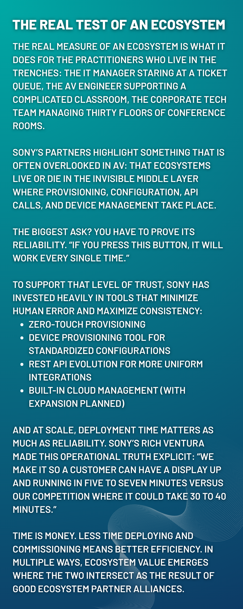 An ecosystem thrives only when everyone involved understands who it truly serves. It’s not built for the manufacturer, nor for the partner network – it’s designed for the person who walks into a room and starts a meeting effortlessly, and for the signage manager who depends on nonstop reliability even as content shifts in real time. Success isn’t defined by the number of integrations or logos attached; it’s defined by simplicity in use, management, deployment, and in ongoing evolution. When the customer experiences that ease, the ecosystem is fulfilling its purpose. Achieving this is possible today by following the lead of industry pioneers – Sony among them – who are setting new standards for ecosystem best practices.