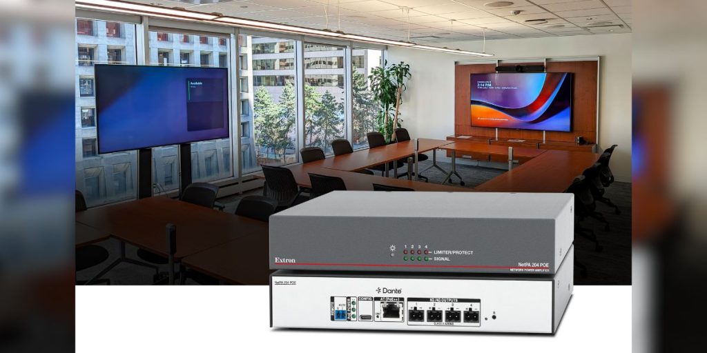Extron introduced the NetPA 204 POE, a Dante-enabled, PoE-powered four-channel audio amplifier delivering up to 20 watts per channel. Designed for discreet installation, the compact amplifier is built for plenum-rated spaces and can be mounted above ceiling tiles, keeping it out of sight and near the speakers.