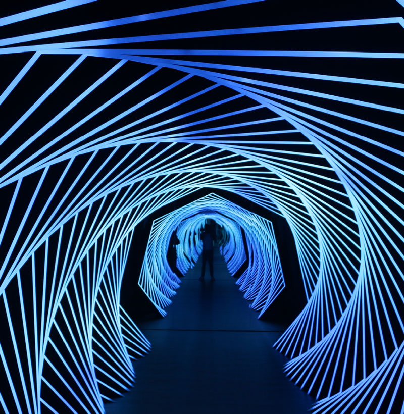 The journey through The Sense Gallery begins in the Tunnel of Light. As visitors pass through the portal of illusion, vibrant lights-capes dance and intertwine like dreams coming to life. Mirrors amplify the enchantment, multiplying sensations and transporting attendees on an exciting journey through time and space accompanied by ethereal harmonies with a synthesized backing track. Leading Technologies installed AtlasIED SM52T surface-mount speakers, cleverly hidden among the light displays and positioned outside the tunnel. The speakers comprise a highly efficient woofer section and a FerroFluid-cooled, titanium dome high-frequency driver. Vocal and musical clarity is optimized by the advanced design of the AtlasIED TRX Control WaveGuide high-frequency director. These speakers provide visitors with clear and detailed sound, utilizing the sense of hearing to guide them through the tunnel. AtlasIED’s 1200-watt DPA1202 multi-channel amplifier powers the speakers. The network-based DPA1202 is a 4-channel amplifier that can be configured in three different amplification arrangements to meet the design requirements of any installation. The final result of managing the delays between the various speakers creates a realistic tunnel effect.