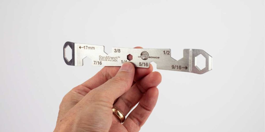 Lectrosonics introduced the StandWrench, a multi-tool that’s precision laser cut from 14 gauge, cold-rolled stainless steel and yet weighs only 1.5 Oz (42.5 g). With a nearly flat profile, the StandWrench is designed to be ultra-portable and fits neatly into a gig bag or instrument case pocket. The wrench has specific hex “sockets” for 17mm, 9/16”, ½”, 7/16”, 3/8” and 5/16” along with a large flat-blade screwdriver tip, covering the most common adjustment points on professional music stands.