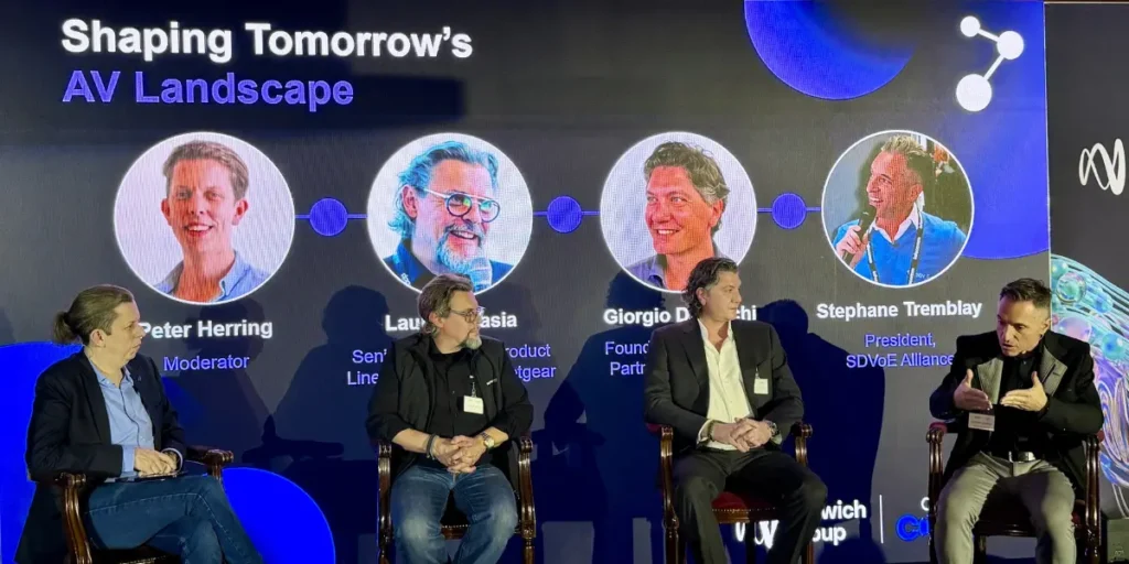 Joe Way of UCLA and HETMA presented “Beyond Borders: Designing Connected Campuses That Deliver Experiences Anywhere,” examining how connected technologies are influencing experience-led design. A panel discussion titled “Shaping Tomorrow’s AV Landscape,” moderated by Peter Herring, technical director for the Middle East at Midwich Group, included Laurent Masia of Netgear, Giorgio Devecchi of Vita Events and Stéphane Tremblay of the SDVoE Alliance.