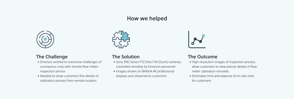 The innovative solution introduced by Emerson makes use of Sony SRG Series remote PTZ (Pan Tilt Zoom) cameras, allowing flow-meter customers to observe details of the calibration process and give approval from their own location.