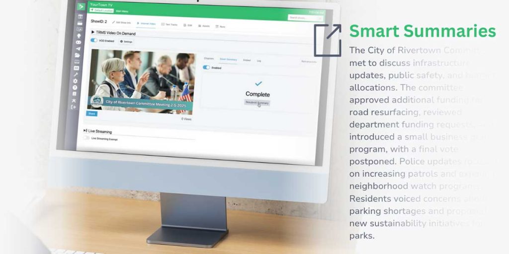 Powered by AI technology, the new Cablecast Smart Summary automatically indexes and creates chapters of government meetings, which enhances transparency and makes government more efficient and approachable. With searchable, editable transcriptions, Cablecast Smart Summary ensures minutes are detailed and accurate—without clerks having to re-watch an entire meeting. It also summarizes content, which saves staff hours of manual effort, and empowers Cablecast users to sync video chapters to agendas. For VOD viewers, the time-saving Cablecast Smart Summary allows them to easily jump to specific discussions, agenda items, votes, and more within meetings.